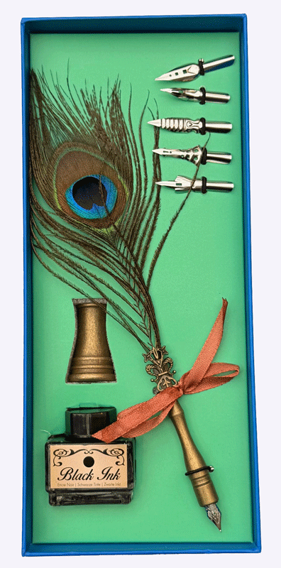 Federstift mit Pfauenfeder, Schreibfedern, Tinte und Ständer – Elegantes Kalligraphie Schreibset